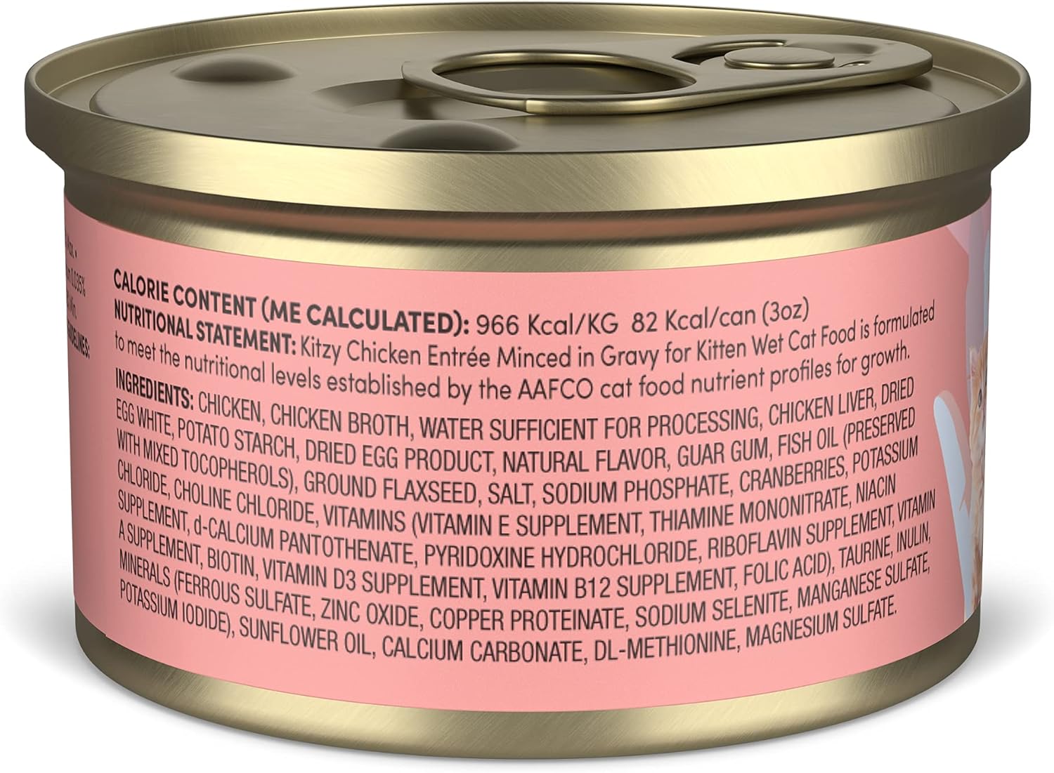 CONTAINS: 24 pack of 3 oz cans of Kitzy Wet Cat Food, Chicken Entrée, for kittens.