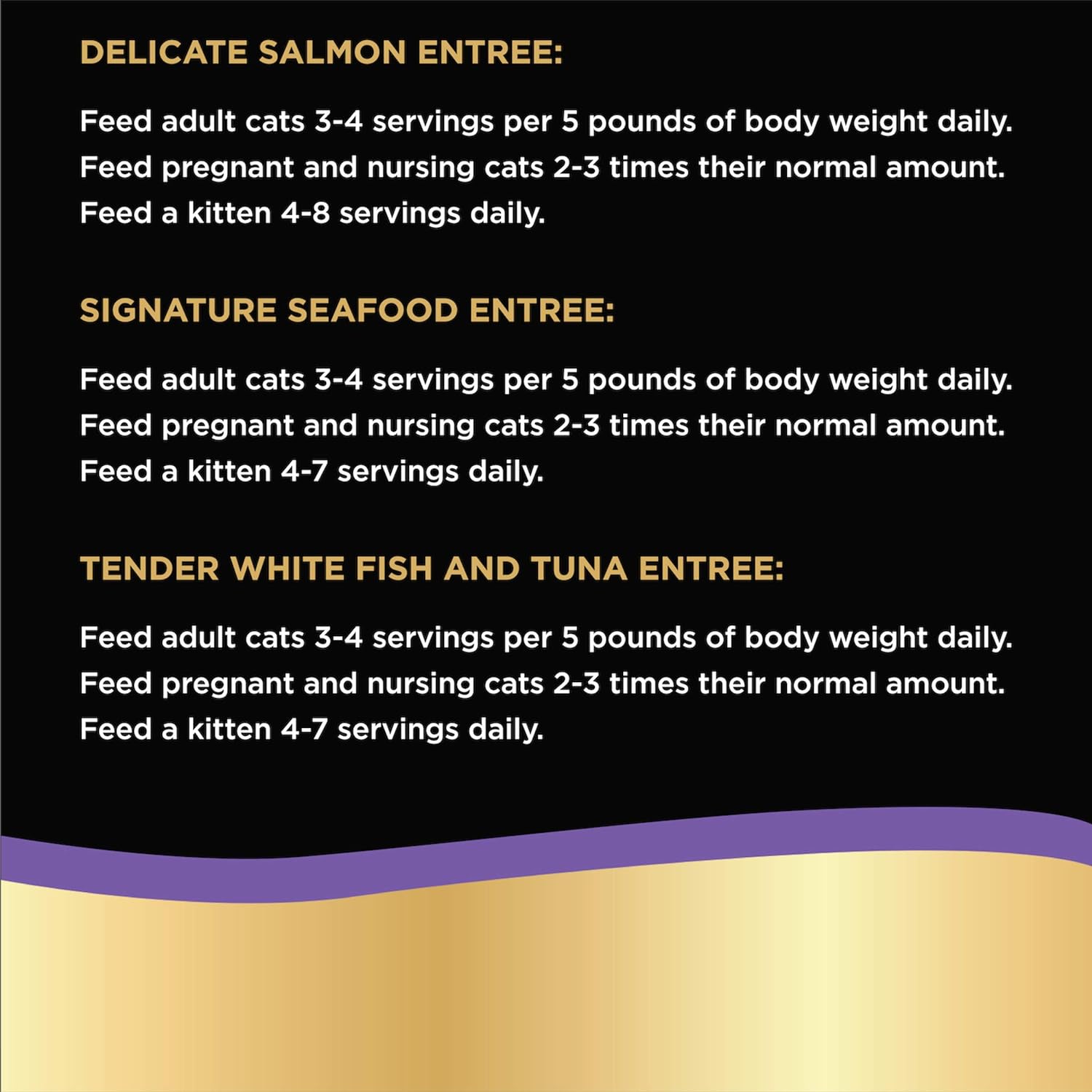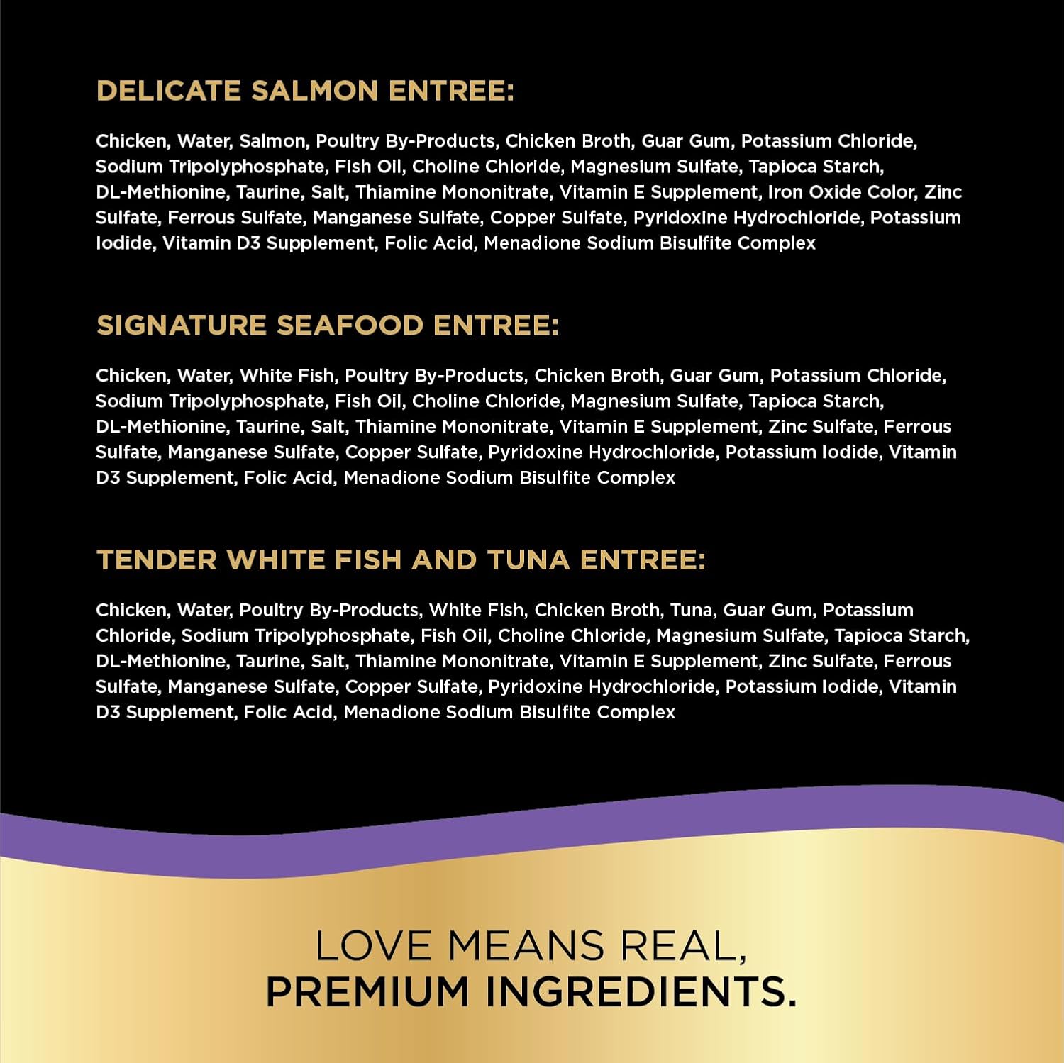 Variety pack contains three delectably soft cat food entrées with the light texture and irresistible seafood flavor cats love